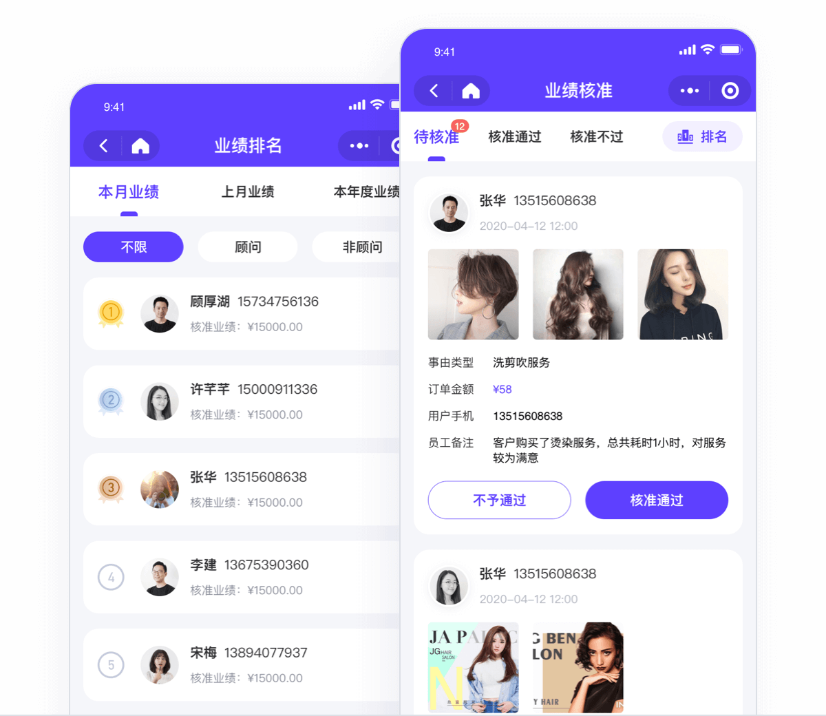 员工可在微信小程序端提交自己的业绩,填单需要选择事由类型、上传拍照、设置订单金额、用户手机号和员工备注。