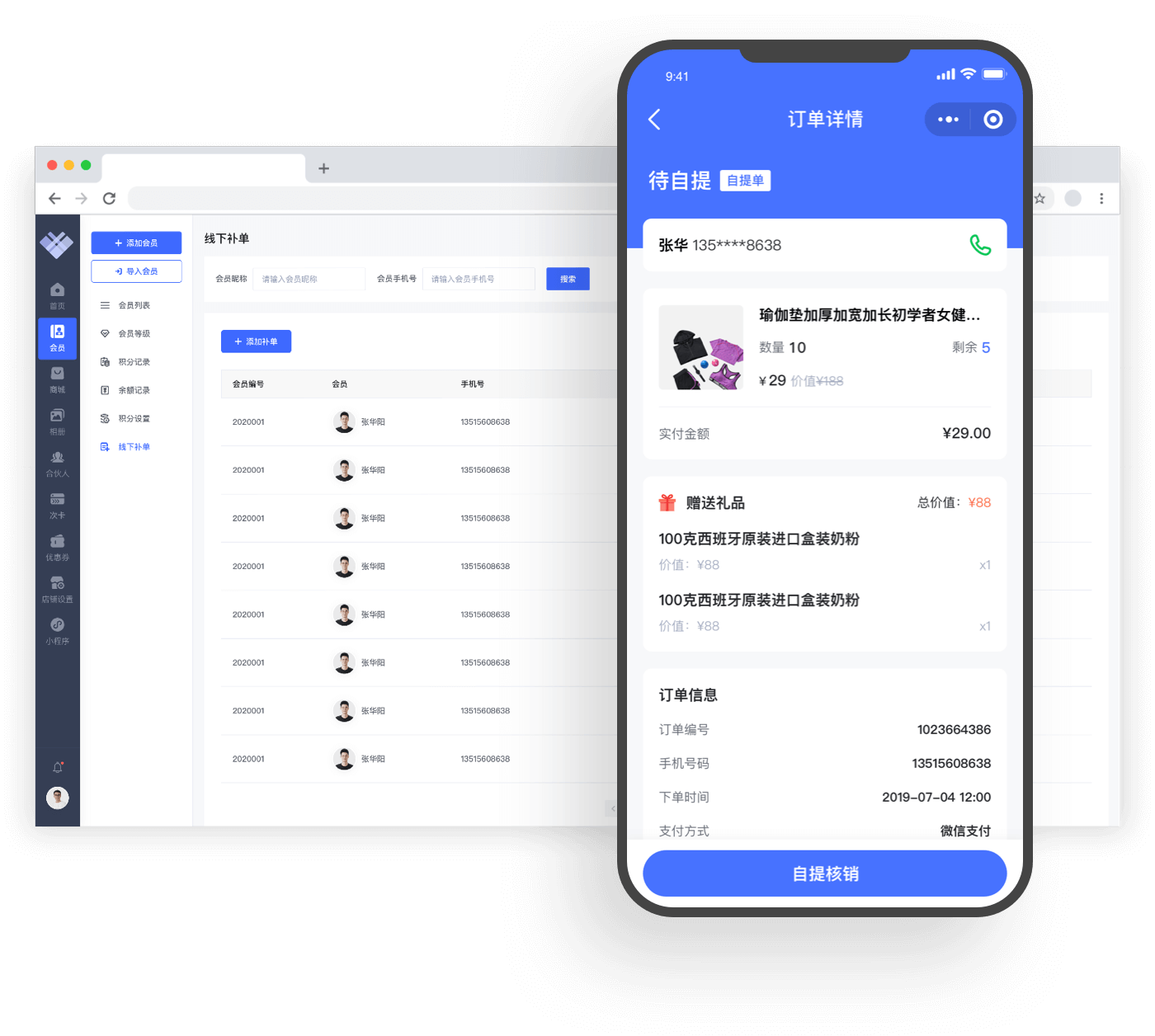 商户和员工可分别在PC管理端和手机上替客户补单,补单金额会立马形成一条充值记录并消耗掉